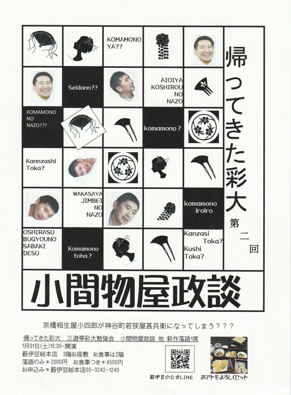 というわけで勉強会は『小間物屋政談』と新作ネタ下ろし2席の計3席やろうと思います。